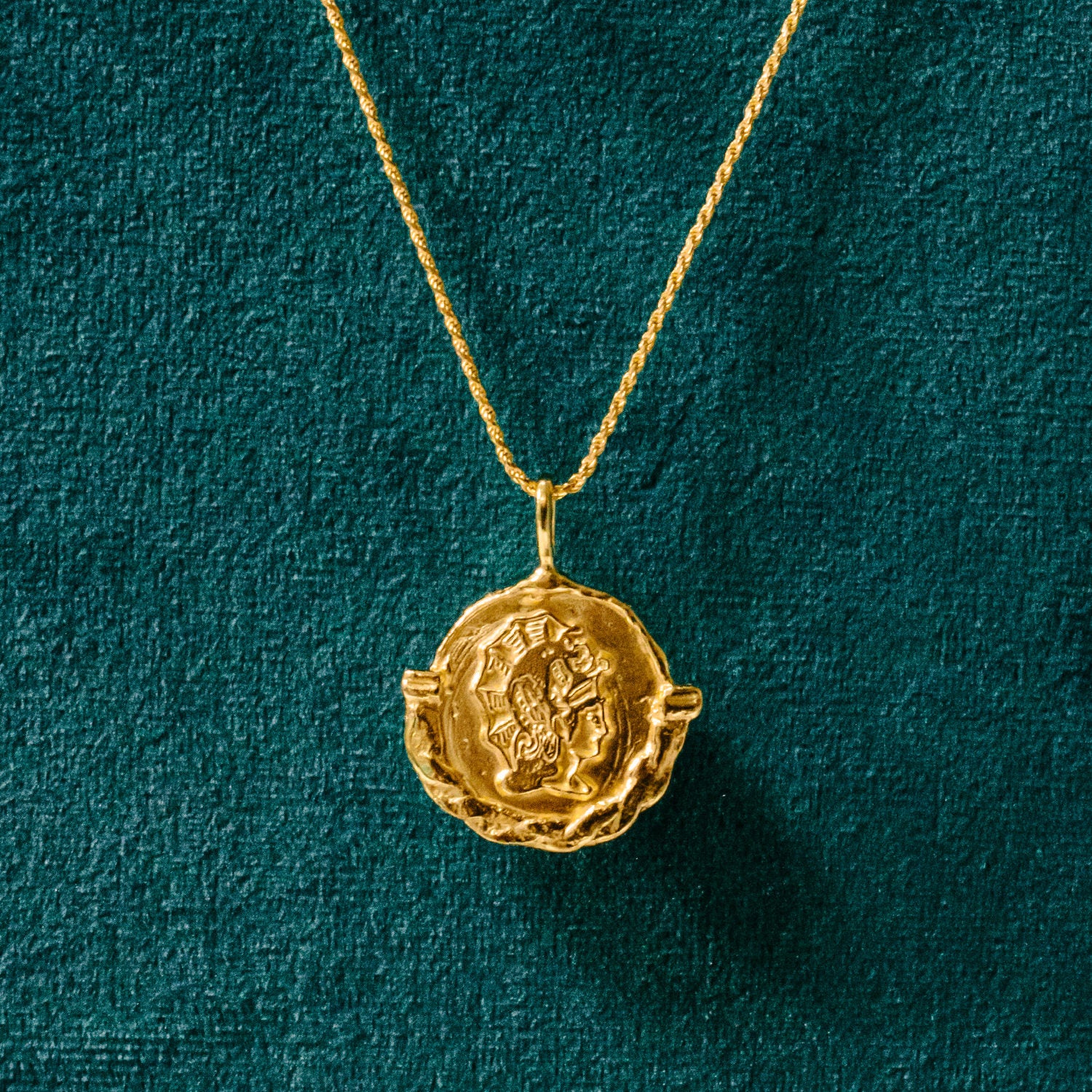 星座墜鍊是最經典的飾品,THRIVE繁生 這次從史料閱讀,以手繪定義設計稿,個別經由蠟胚雕刻再開模鑄造而成。每一枚金幣似的圓餅墜子皆有對應十二星座的半人半獸獨立圖案,是邁諾安青銅和古風時期,以及伯羅奔尼薩陷入衝突與重組的的古典時期相互混合的文化特徵。
