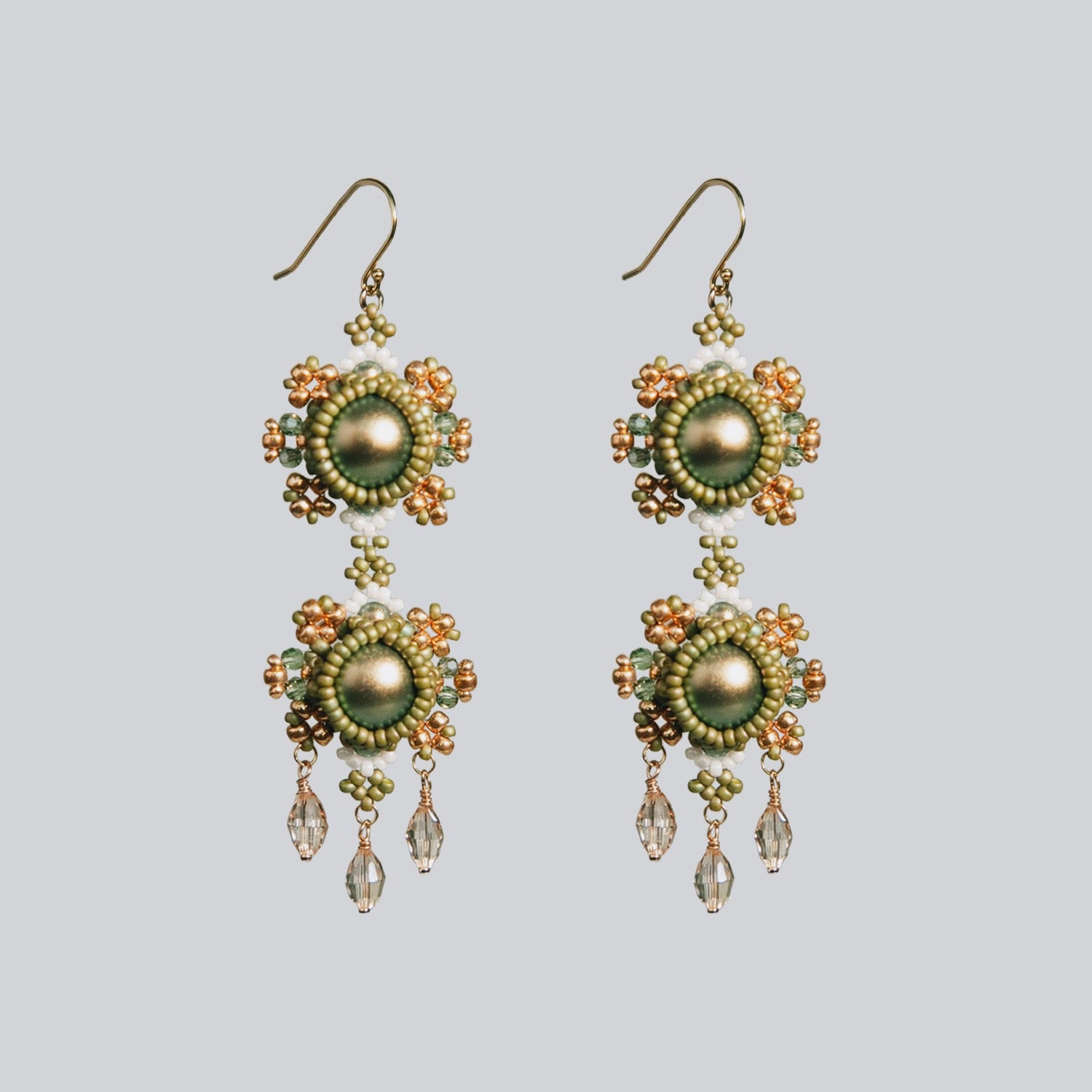 The serene gold-green radiance flows through delicate hand-beaded work, with a dual disc structure resembling the compass rose of ancient nautical charts, guiding those who wander. Gold filigree surrounds the center like constellations that remain steadfast after a storm passes, while crystal pendants suspended below refract light and shadow like scattered silver on the sea's surface during changing tides. These earrings inherit the spirit of the age of exploration, symbolizing endless discovery and reverence for the unknown, perfect for souls who yearn for adventure yet wish not to lose their way.