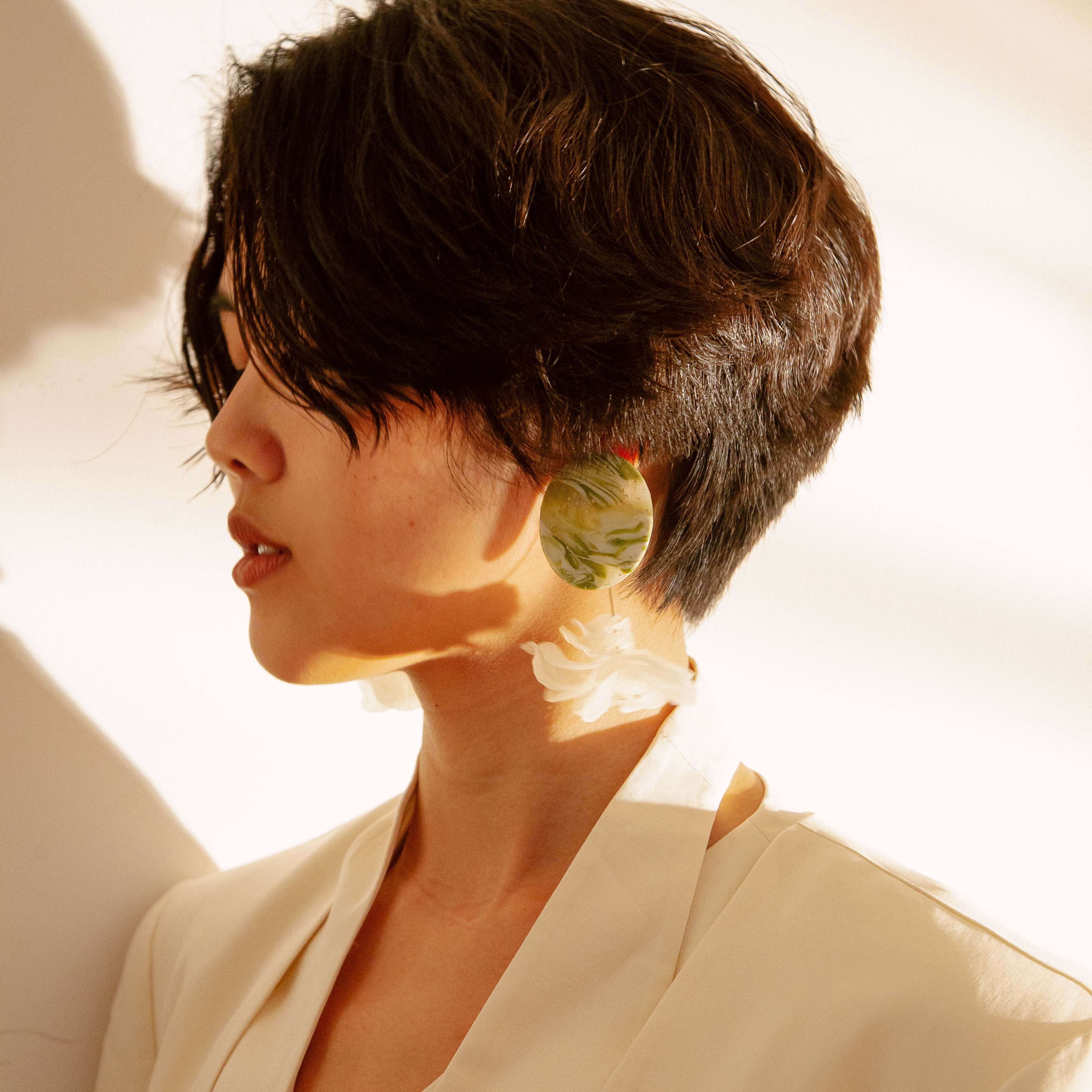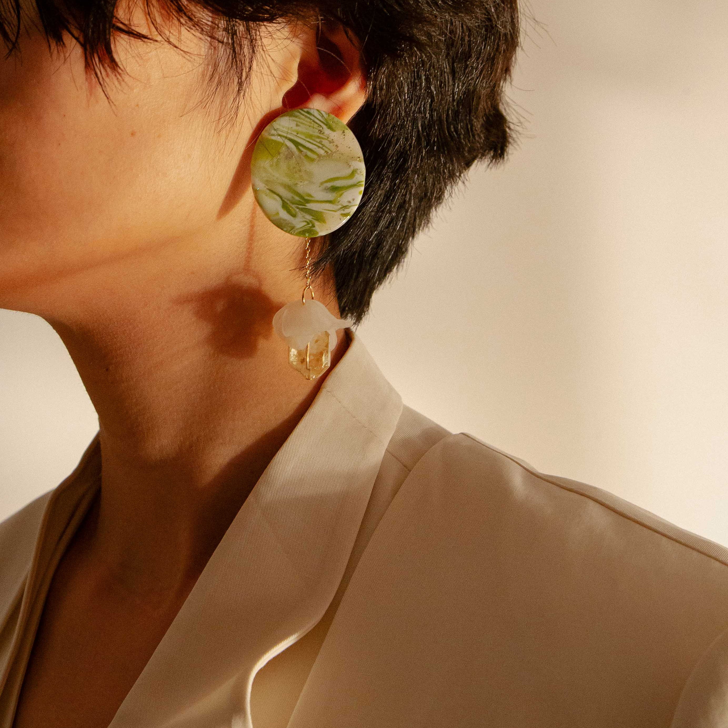 如同結穗的形體,靈感來自於逡巡於撲岸潮汐的細碎扇貝們。上下可拆卸的扣環設計,繁複與簡約一應俱全,無論日常或派對都能兼顧。復刻2018年第一代瑪瑙 Blooming Tides,上部原本沉重的天然石改用手工混色烤製而成的歐洲軟陶圓片,垂墜部的手捏花瓣也更加活潑立體,整體重量更是減輕50%,一對僅有30g,讓因為第一代重量困擾不已的新舊粉絲能有更舒適的選擇!