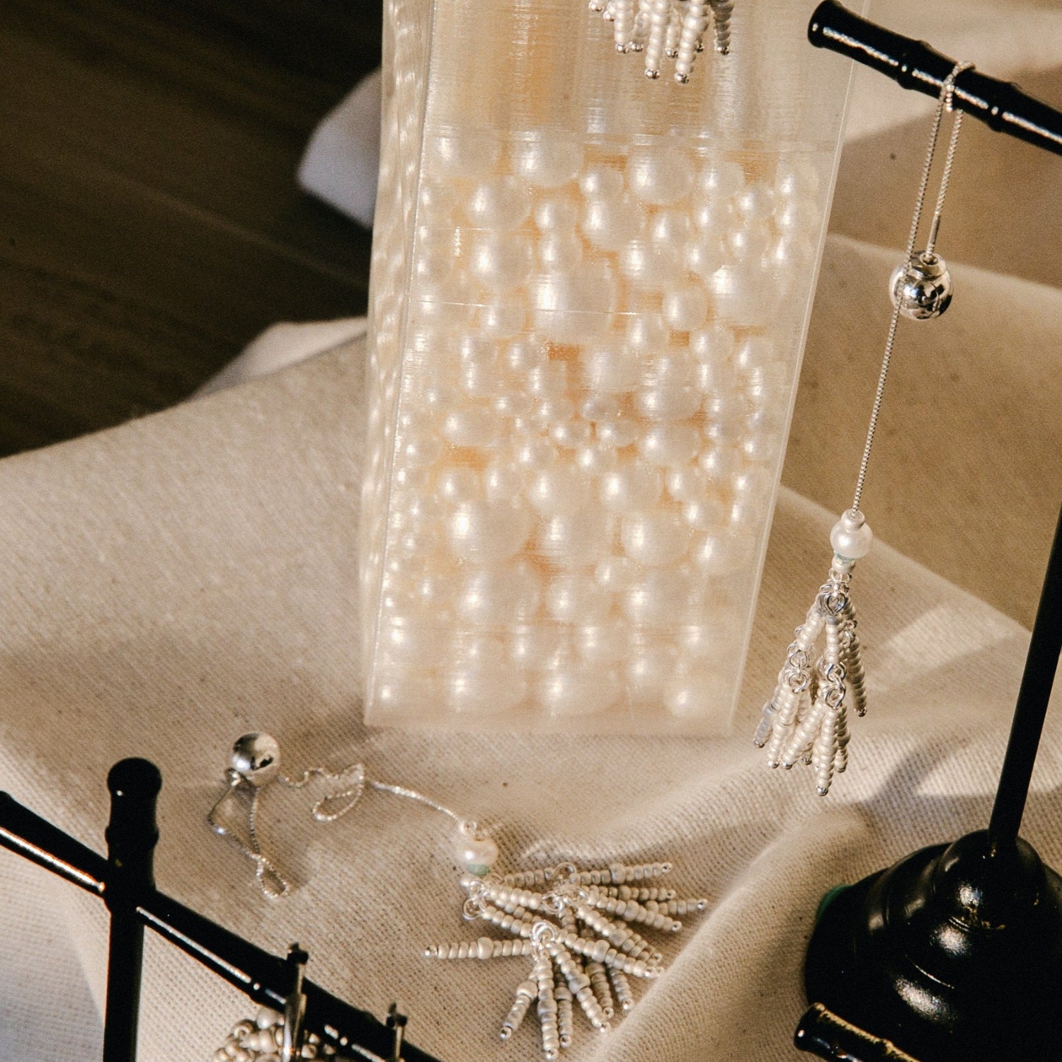 是爵士大師 Duke Ellington 創作的經典曲目《Solitude》。以白銀色磨砂珠搭配層疊的流蘇設計,呈現出樂曲中獨特的情感張力,如同薄霧中婉轉的樂章。流蘇的律動彷彿優雅的鋼琴音符,在薄暮中輕輕擺盪,完美演繹了那個爵士年代對孤寂的浪漫詮釋。