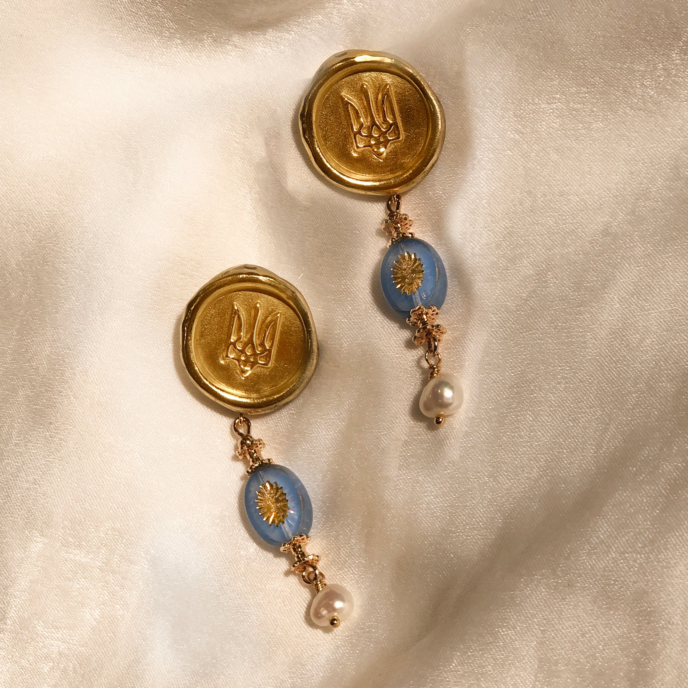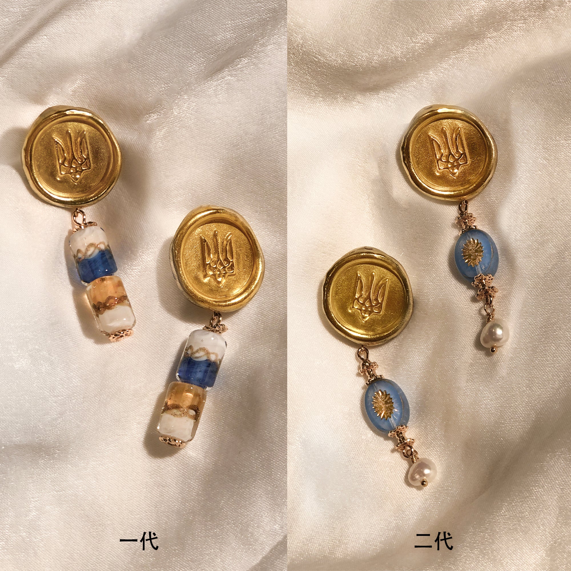 在旗幟上,藍色代表天空與海洋,象徵自由與主權;黃色代表麥田,象徵烏克蘭悠久的農業歷史。這二色源自該國盾徽上的設計,我們找出了相應的琉璃珠做成藍天金麥的小吊墜,搭配18K銅鍍金的封蠟古幣狀上半部耳飾(上下可拆卸)。