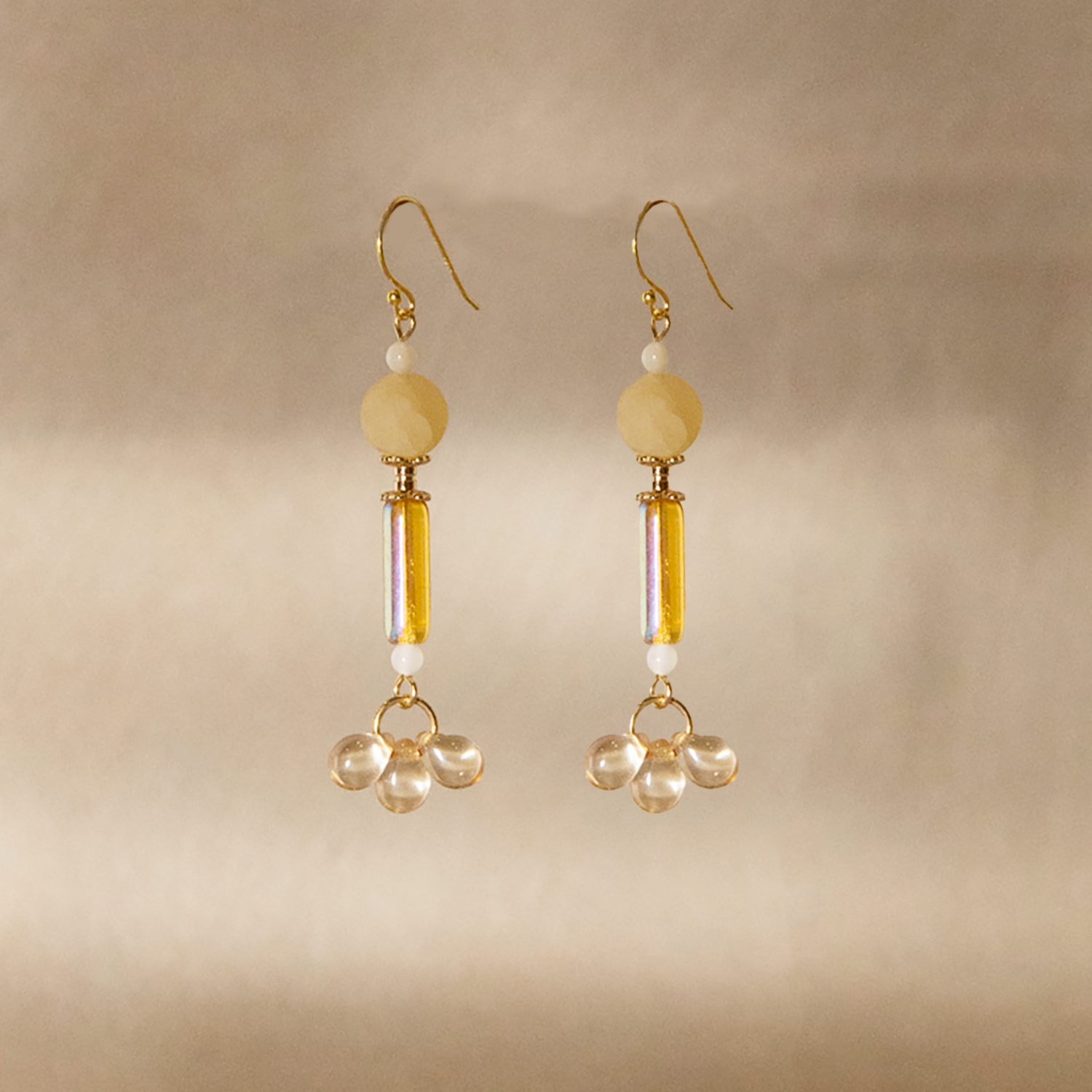 如同夏日中成熟的芒果,這款耳環以黃色玻璃珠與黃玉搭配,猶如一束陽光穿越耳畔。它將為您注入一份夏日的活潑。