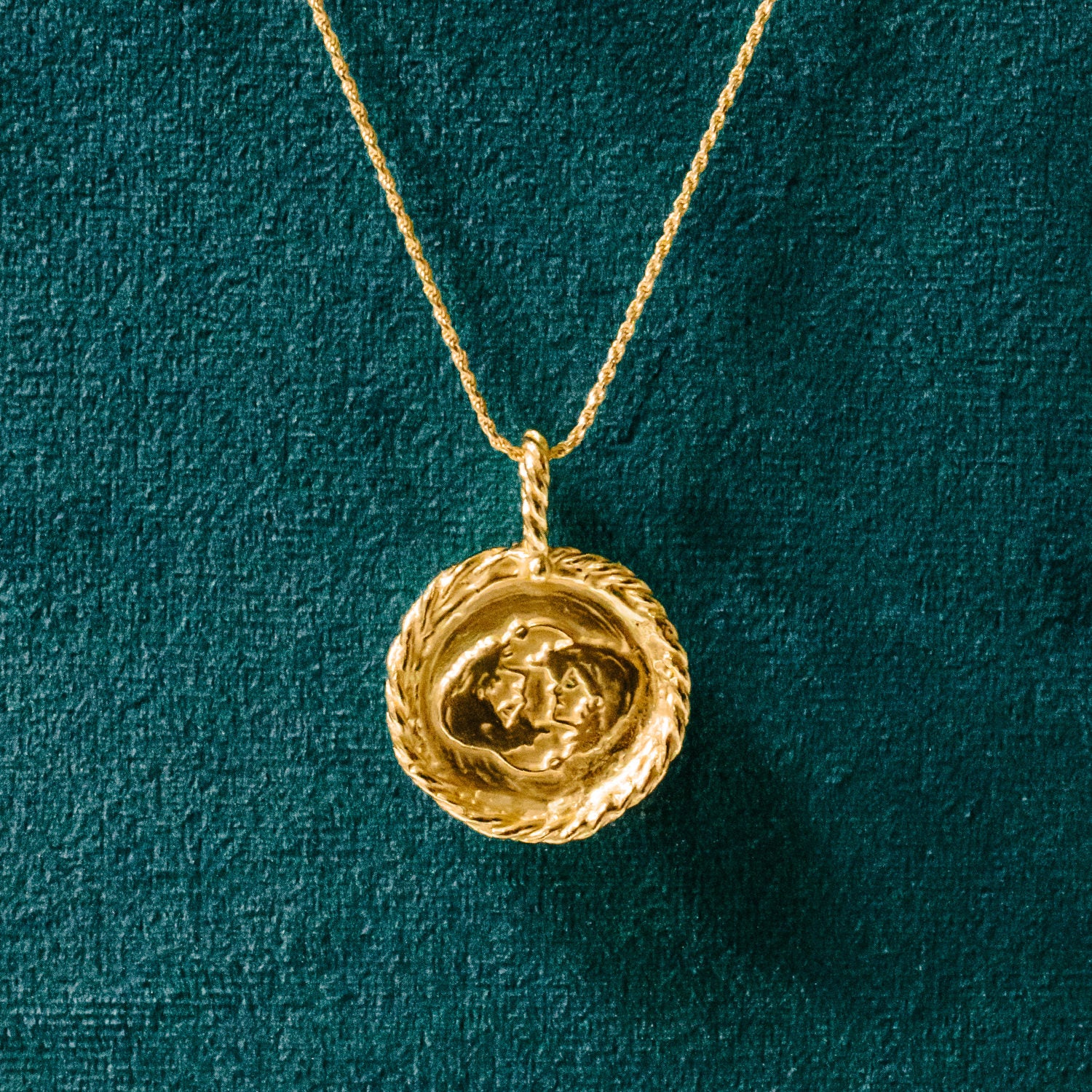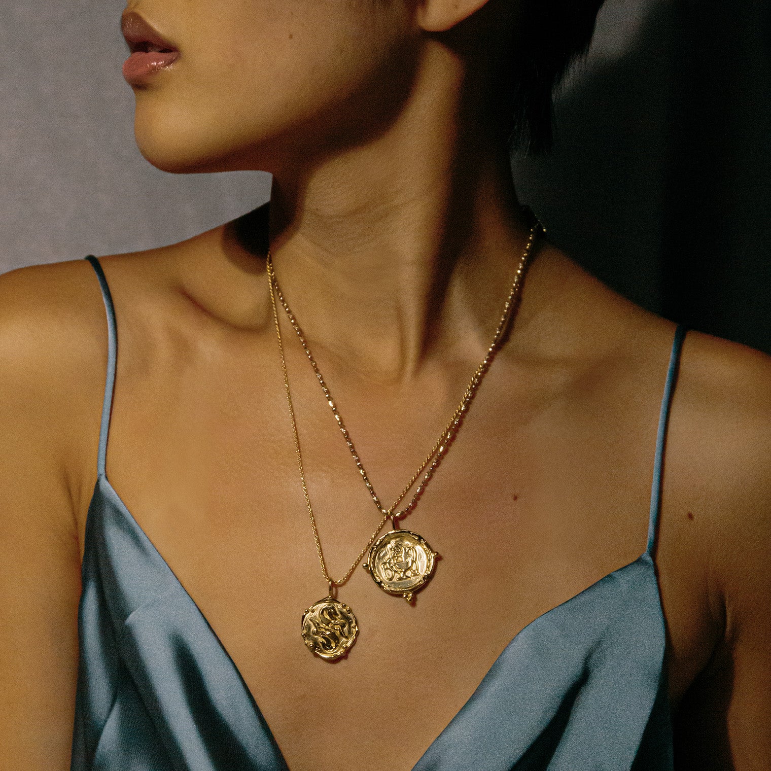 星座墜鍊是最經典的飾品,THRIVE繁生 這次從史料閱讀,以手繪定義設計稿,個別經由蠟胚雕刻再開模鑄造而成。每一枚金幣似的圓餅墜子皆有對應十二星座的半人半獸獨立圖案,是邁諾安青銅和古風時期,以及伯羅奔尼薩陷入衝突與重組的的古典時期相互混合的文化特徵。
