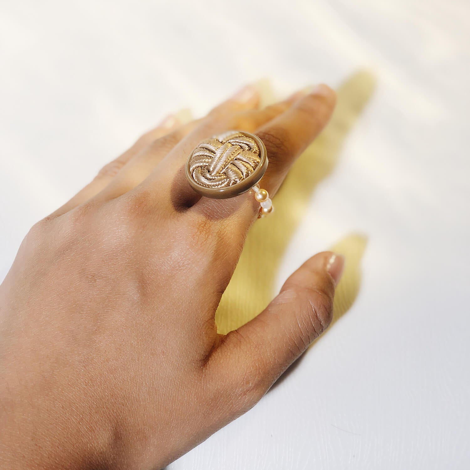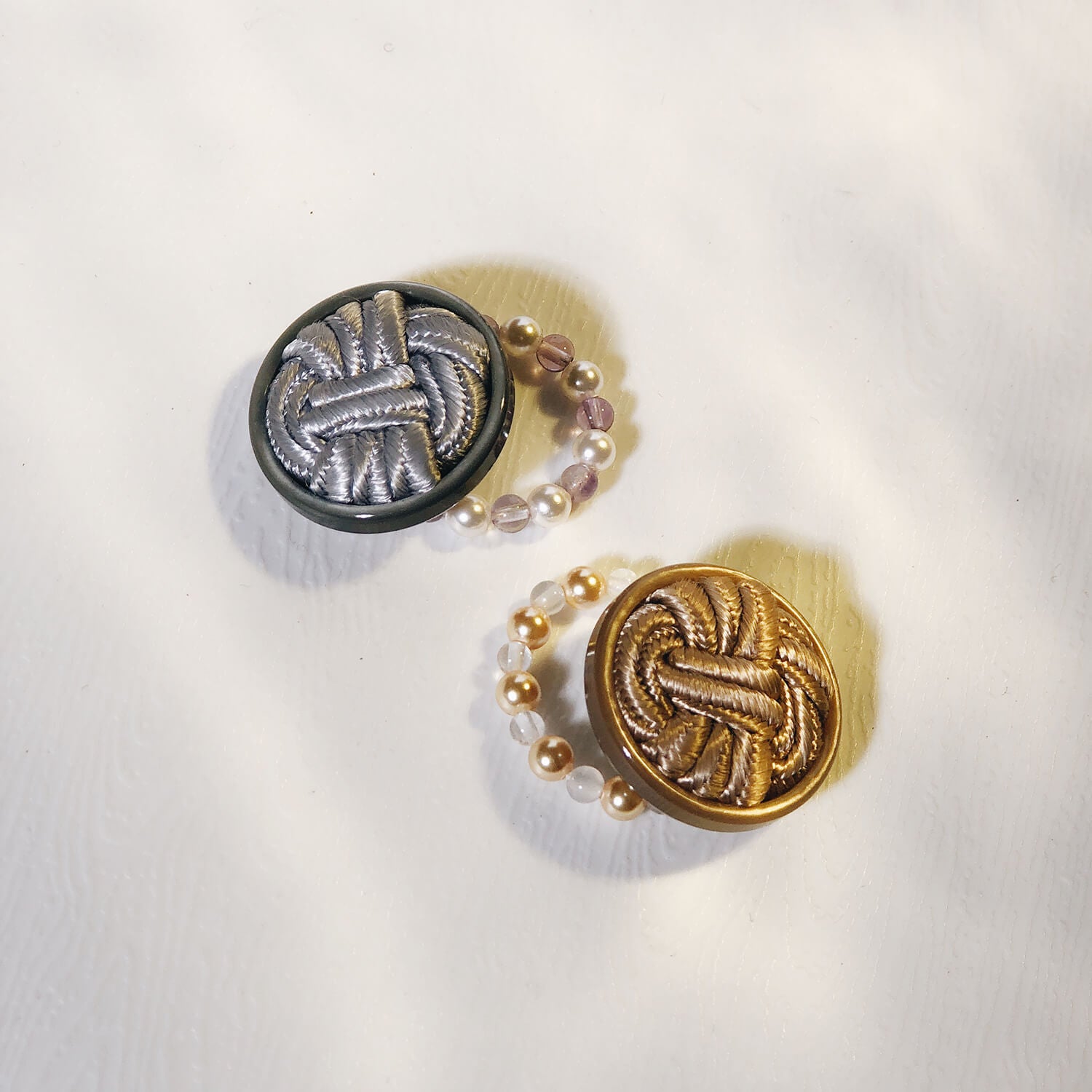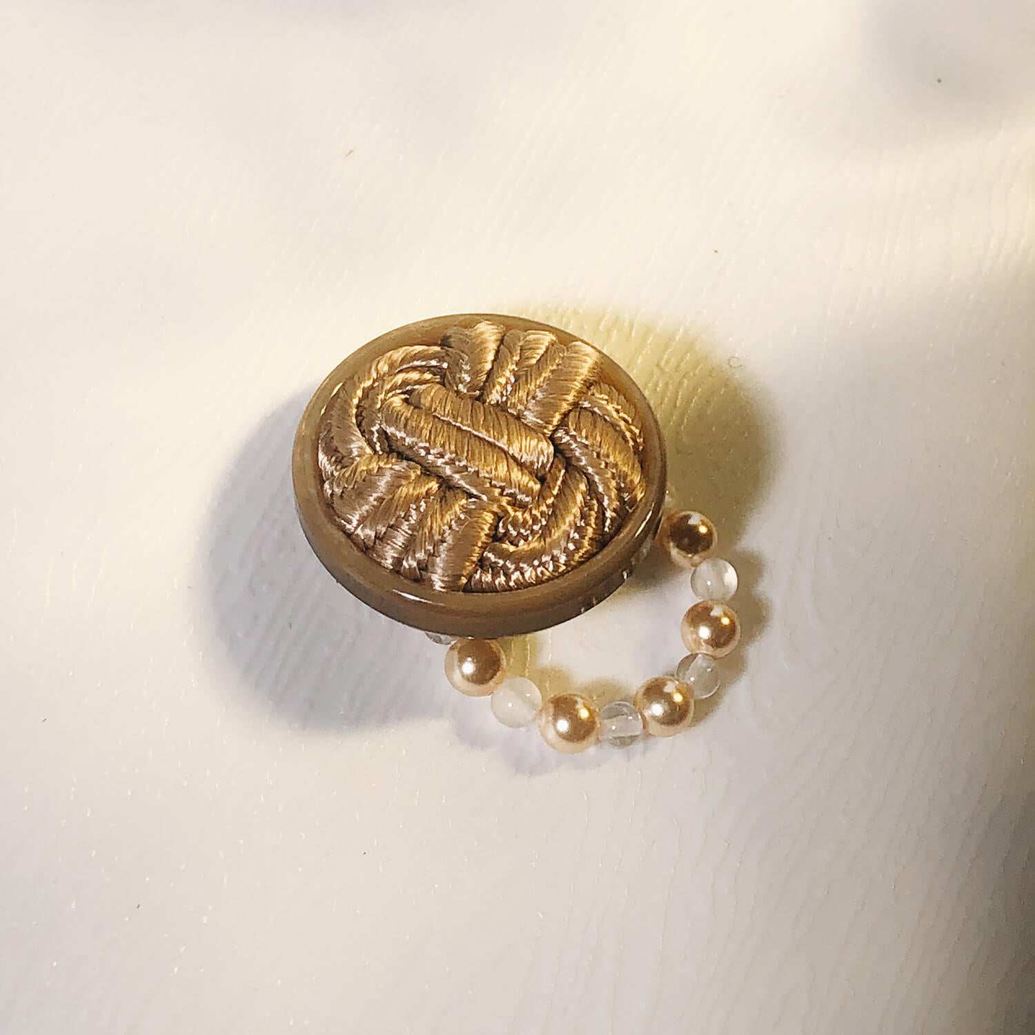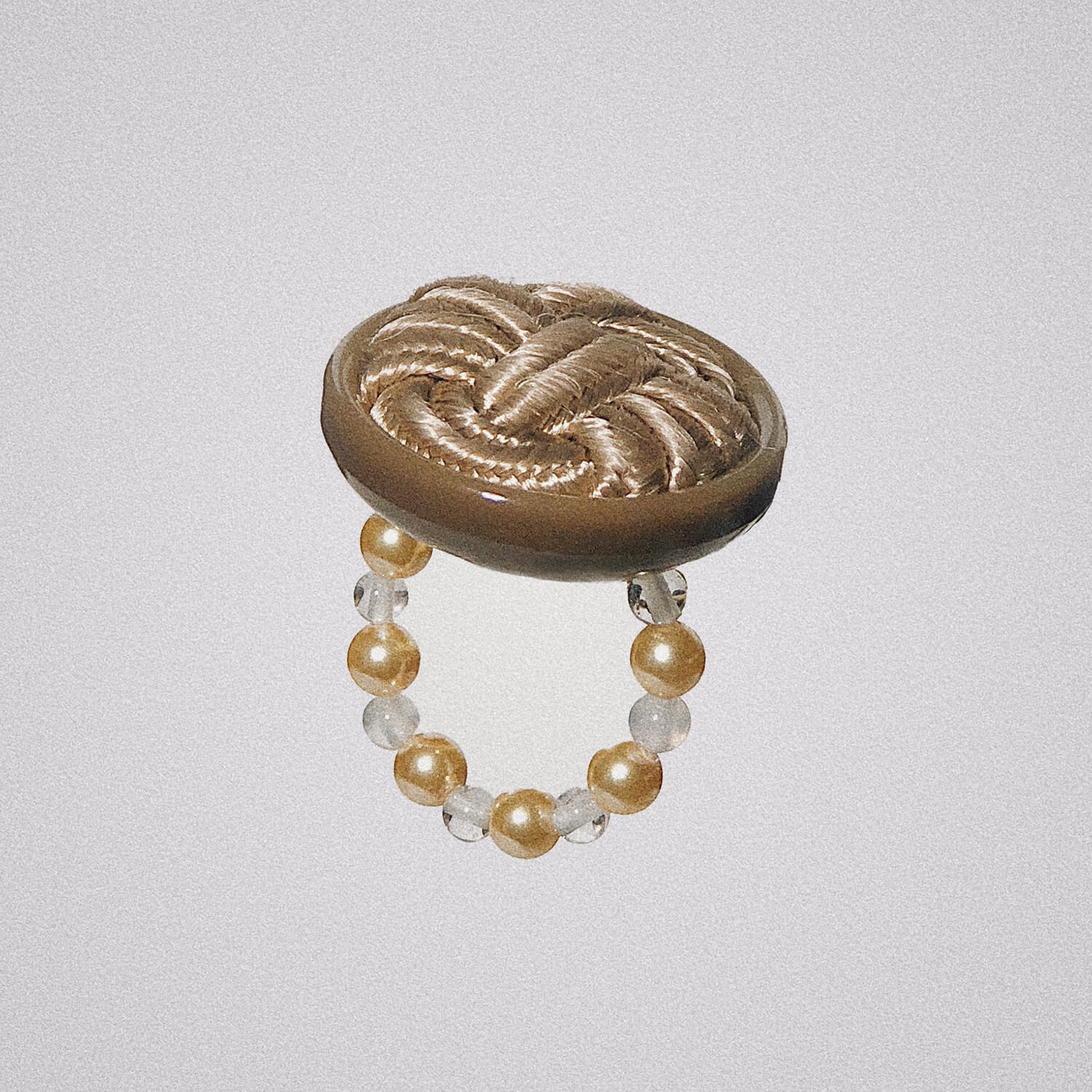 交織的絲線看起來像是蒙布朗蛋糕上層層覆蓋的擠花栗子泥 Purée,我們讓縫在舊衣上逐漸被遺忘的浮誇老扣再生,成為指間的一小盤迷你香甜。