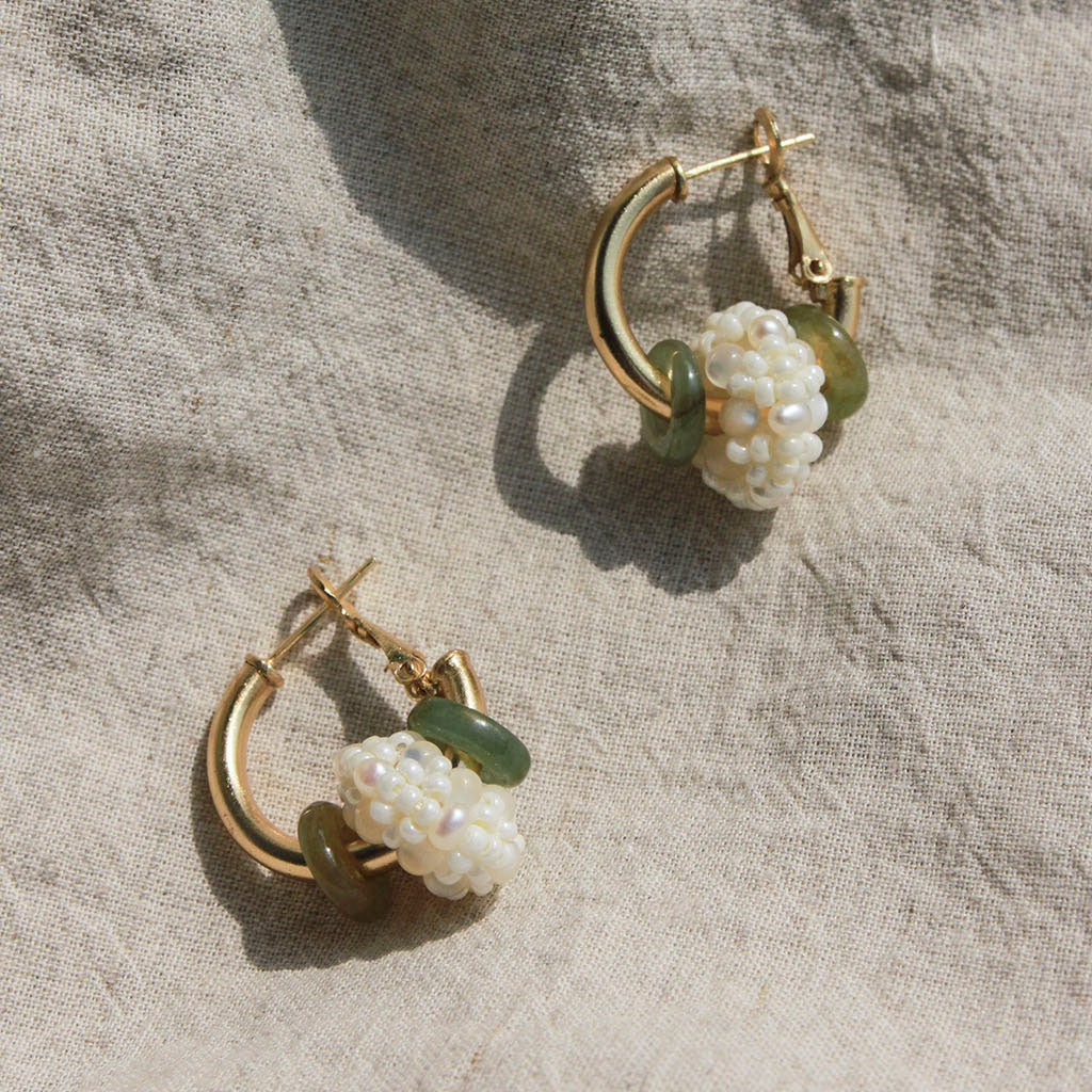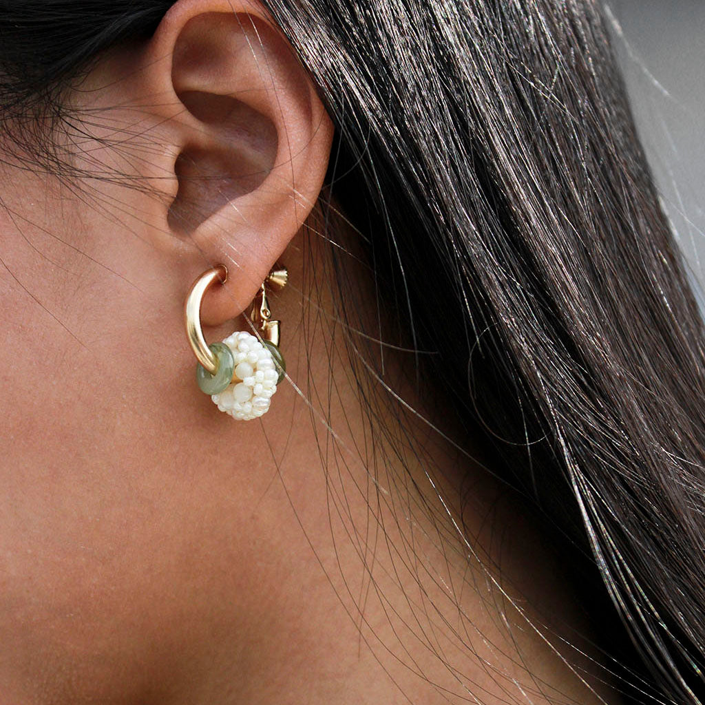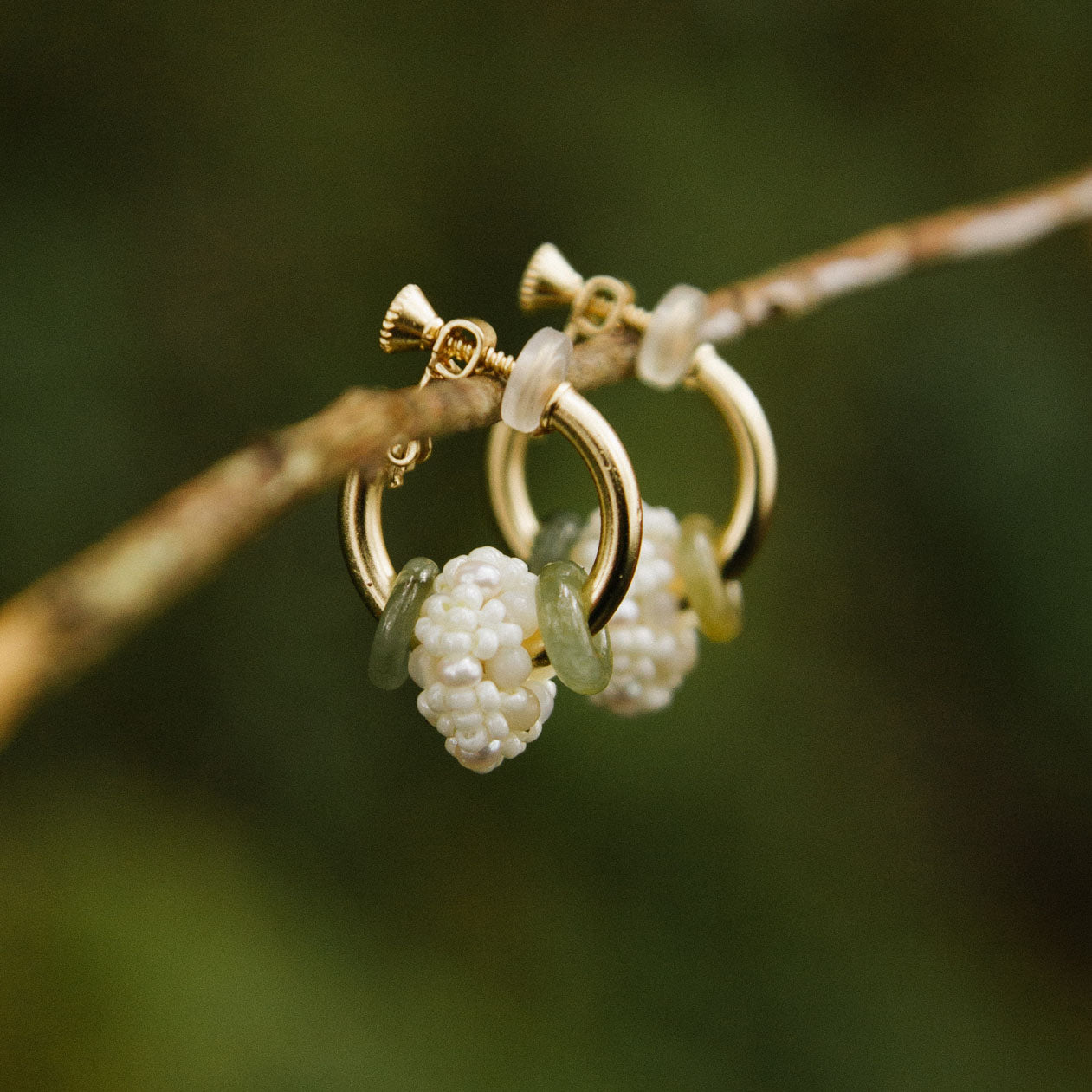 野寶以古代食器「敦」為靈感的圈式耳環,使用管材製作,厚實的外型卻相當輕盈。它像容器般,安穩地盛載著冬日裡的綠意,和一針一線手工編製的冰晶雪球,留住山中陽光升起前難得的雪景。把用在 Papanași 珍珠甜麵圈系列的編織小球分解出來,內徑和球體放大了一些讓它更有份量,搭配上敦耳環和玉環剛剛好。