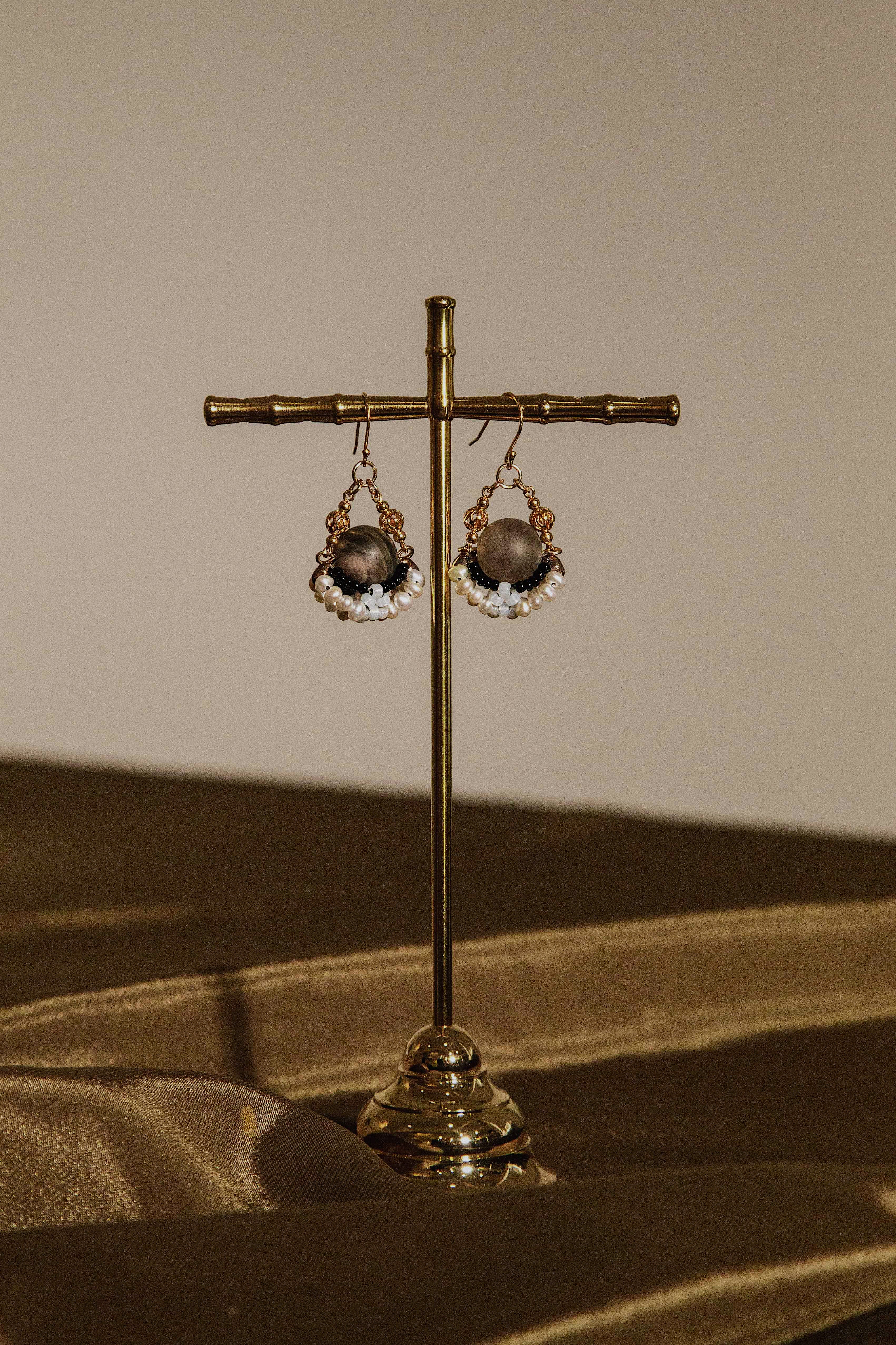 這次五週年的創作用上了三斜晶家族的太陽石,那些暖洋洋的橙紅赤鐵礦、針鐵礦會在石材內呈粒狀或片狀,如其名地奪目耀眼;但比起較受大眾歡迎的金太陽石,我選了看似黯淡卻又迷爍的黑太陽石,它日蝕般的異景有著低調的髮絲及貓眼幻影,如一潭鏡湖被千縷細風撩動粼粼。