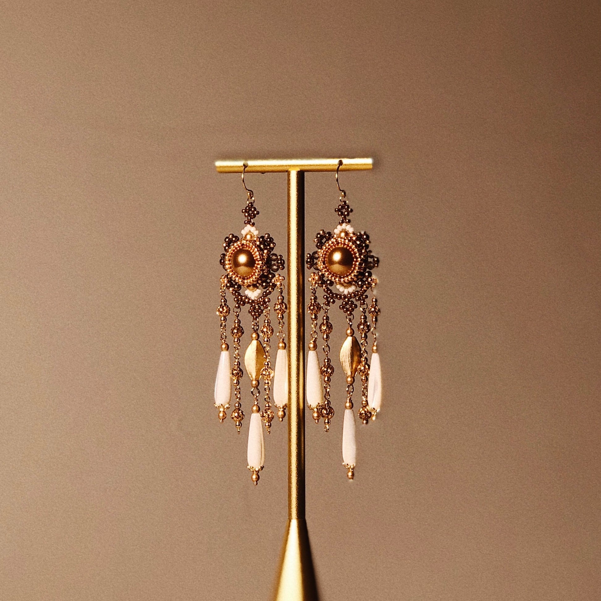 主體由溫潤的金銅色珠子精心編織而成,散發出柔和而華貴的光澤,凝結了夏日的熾熱氣息。