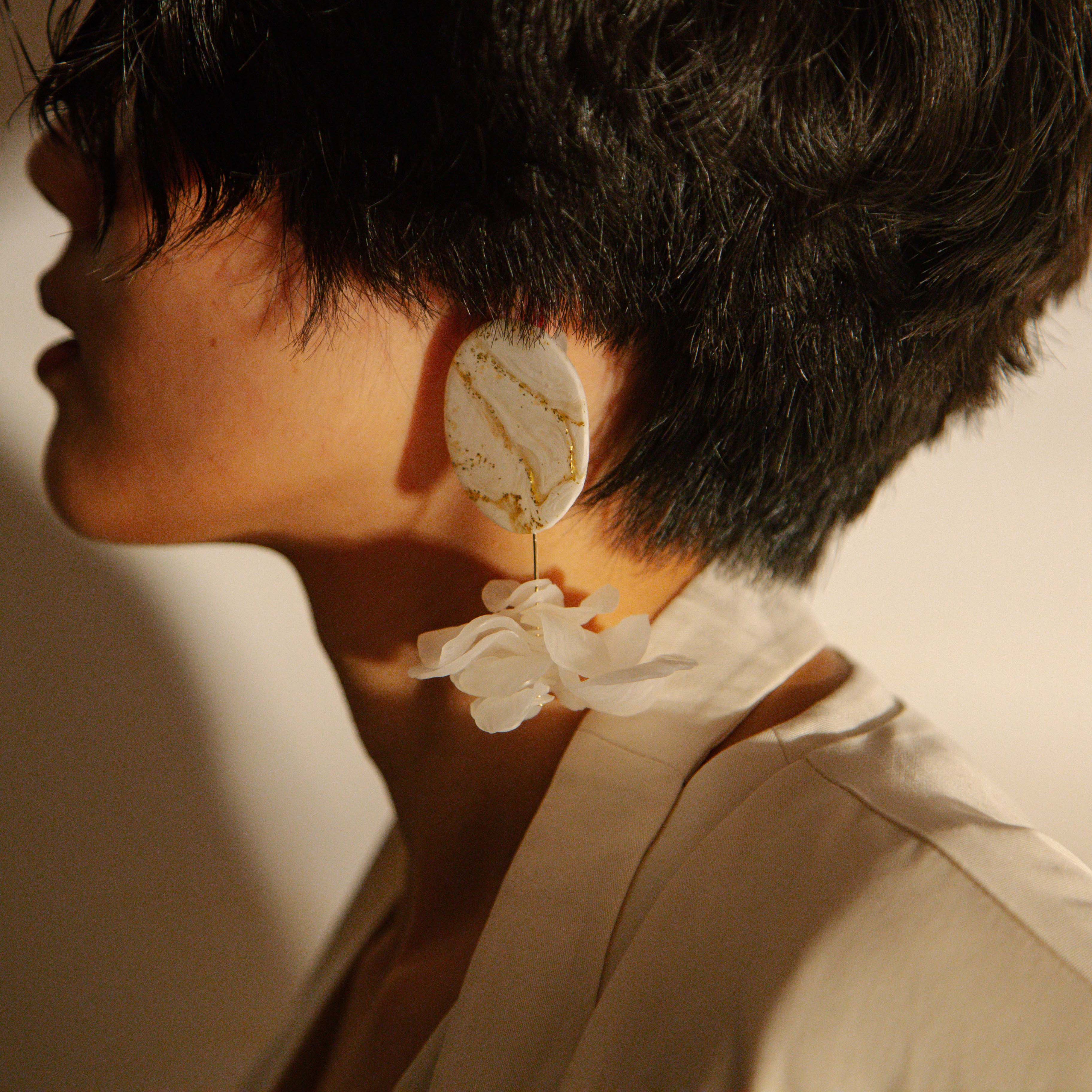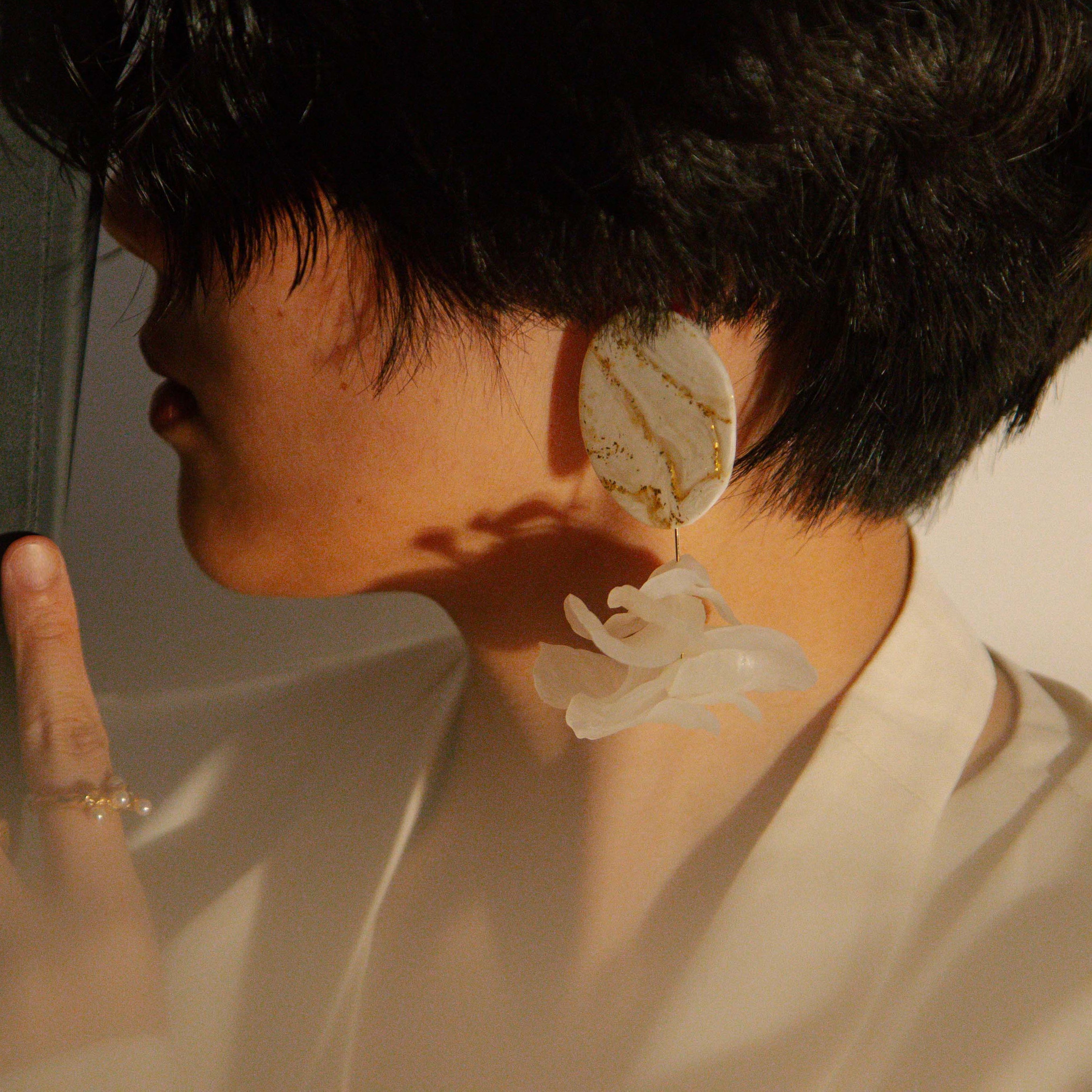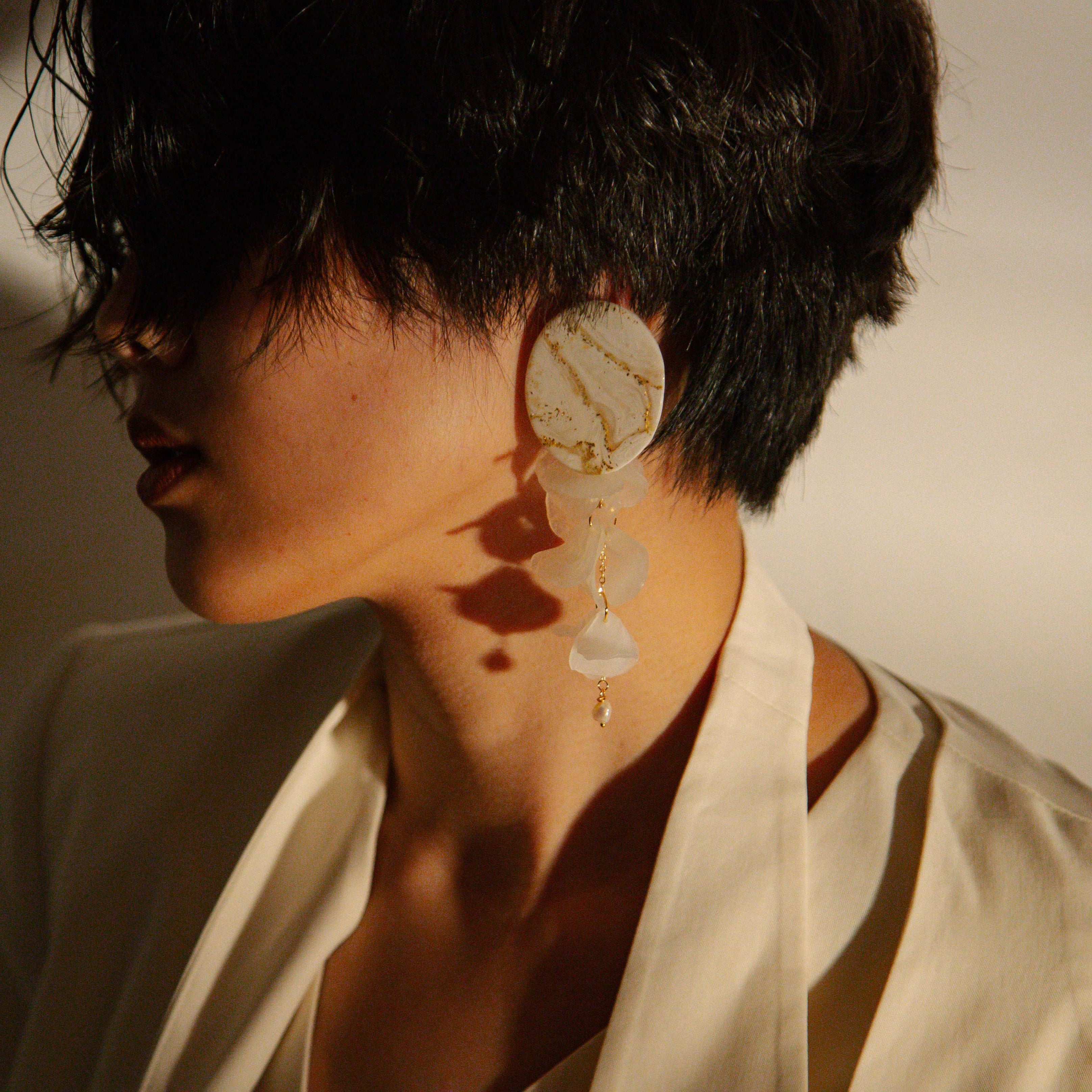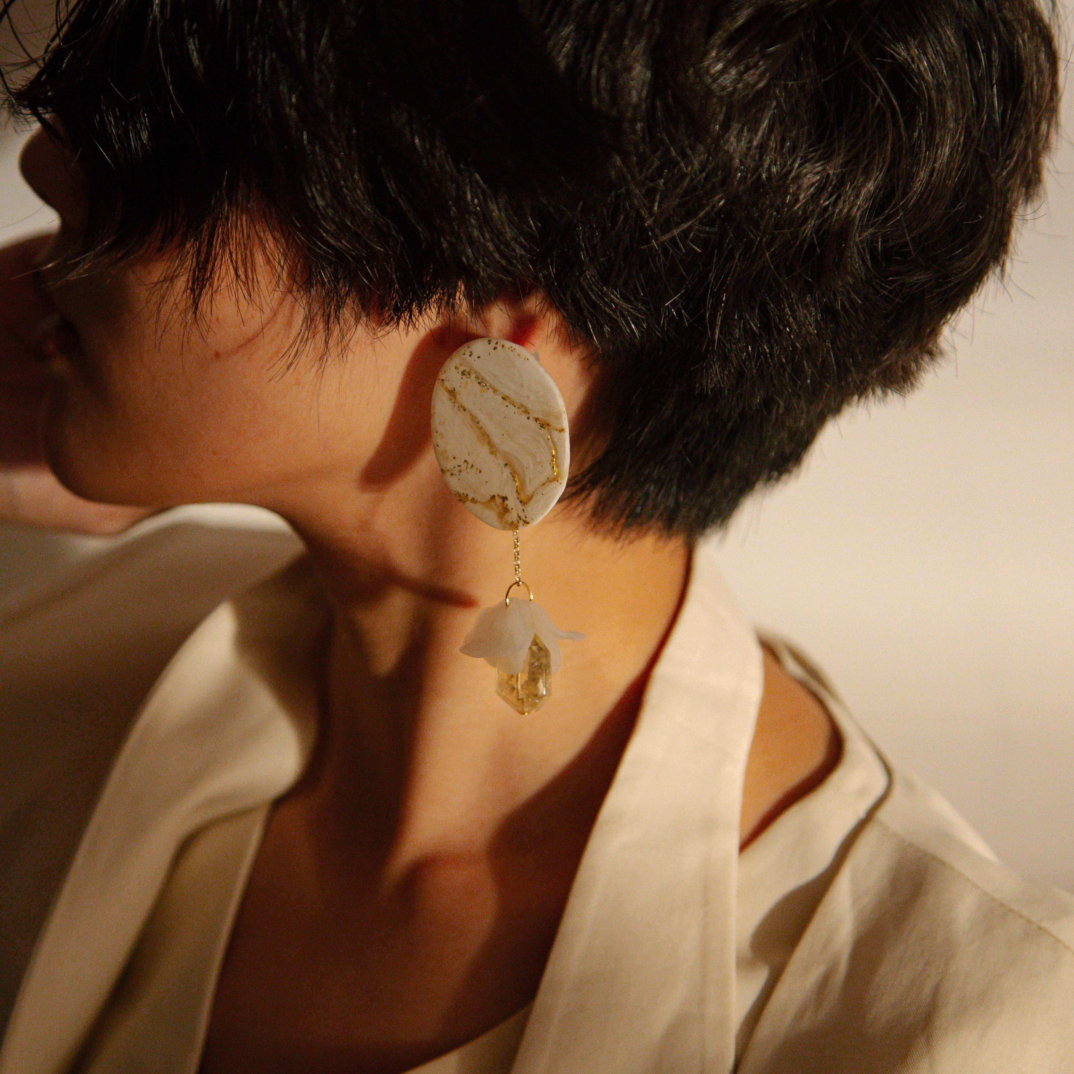 如同結穗的形體,靈感來自於逡巡於撲岸潮汐的細碎扇貝們。上下可拆卸的扣環設計,繁複與簡約一應俱全,無論日常或派對都能兼顧。復刻2018年第一代瑪瑙 Blooming Tides,上部原本沉重的天然石改用手工混色烤製而成的歐洲軟陶圓片,垂墜部的手捏花瓣也更加活潑立體,整體重量更是減輕50%,一對僅有30g,讓因為第一代重量困擾不已的新舊粉絲能有更舒適的選擇!